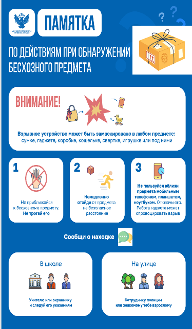 В частности, обучающимся следует в полной мере владеть информацией по действиям при обнаружении предполагаемых взрывных устройств (предметов, хозяин которых неизвестен) ( Алгоритмах действий персонала образовательной организации, работников частных охранных организаций и обучающихся при совершении (угрозе совершения) преступления в формах вооруженного нападения, размещения взрывного устройства, захвата заложников, срабатывания на территории образовательной организации взрывного устройства, в том числе доставленного беспилотным летательным аппаратом, нападения с использованием горючих жидкостей, а также информационного взаимодействия образовательных организаций с территориальными органами МВД России, Росгвардии и ФСБ России (письмо от 28 июня 2023 г. № АБ-2594/14).